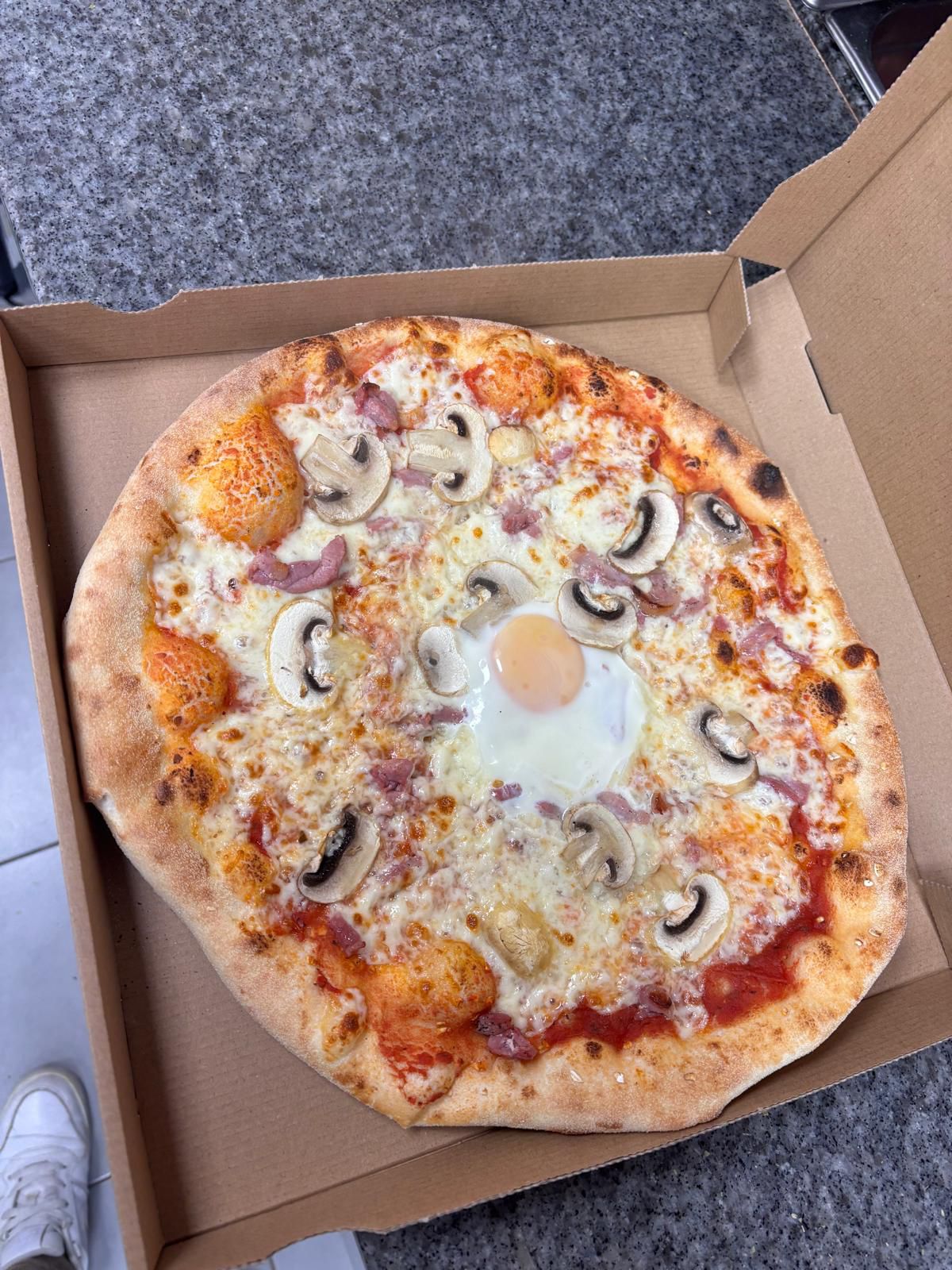 Base tomate, mozza, jambon, champignons, œuf
